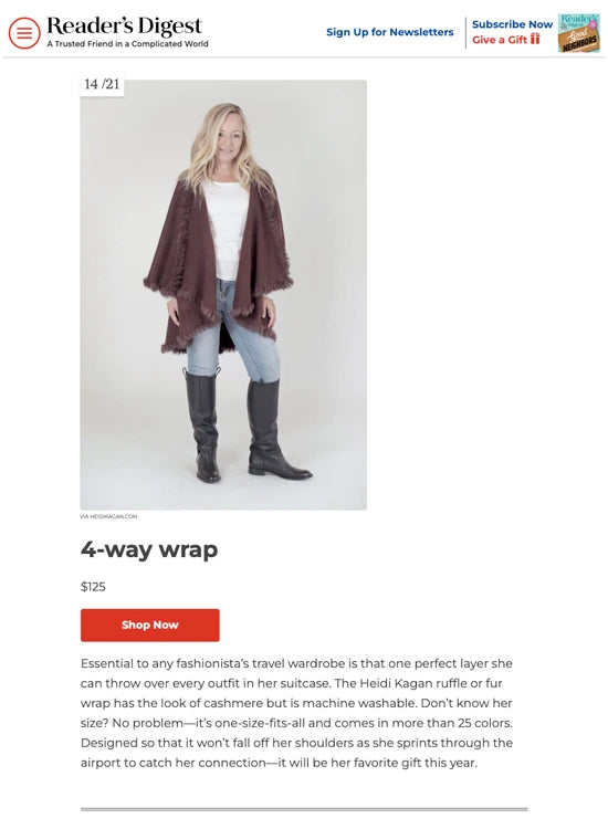"Travelers far and wide have been buzzing about the Heidi Kagan shawl as their must-have travel accessory. This shawl is essential for travelers looking for something versatile."